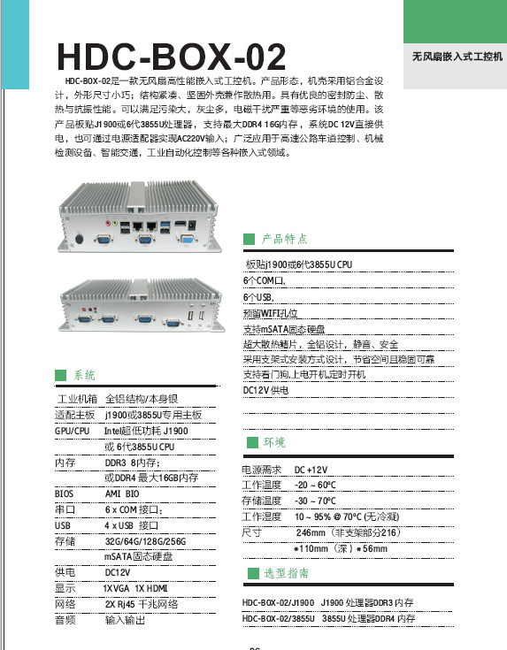 HDC-BOX-02是一款無風扇高性能嵌入式工控機。產品形態,機殼采用鋁合金設計,外形尺寸小巧;結構緊湊、堅固外殼兼作散熱用。具有優良的密封防塵、散熱與抗振性能??梢詽M足污染大,灰塵多,電磁干擾嚴重等惡劣環境...