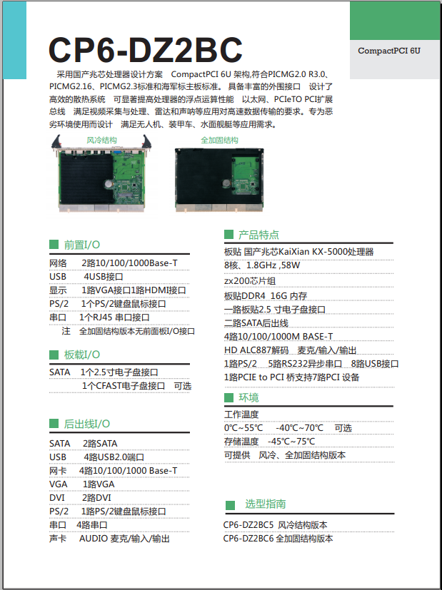 采用國產兆芯處理器設計方案,CompactPCI 6U 架構 符合PICMG2.0 R3.0、PICMG2.16、PICMG2.3標準和海軍標主板標準。具備豐富的外圍接口;設計了高效的散熱系統,可顯著提高處理器的浮點運算性能,以太網、PCIeTO P...