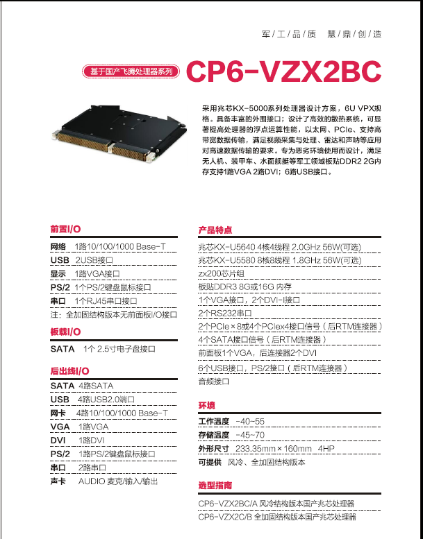 基于兆芯KX-5000系列處理器設計,6U VPX規(guī)格。具備豐富的外圍接口;設