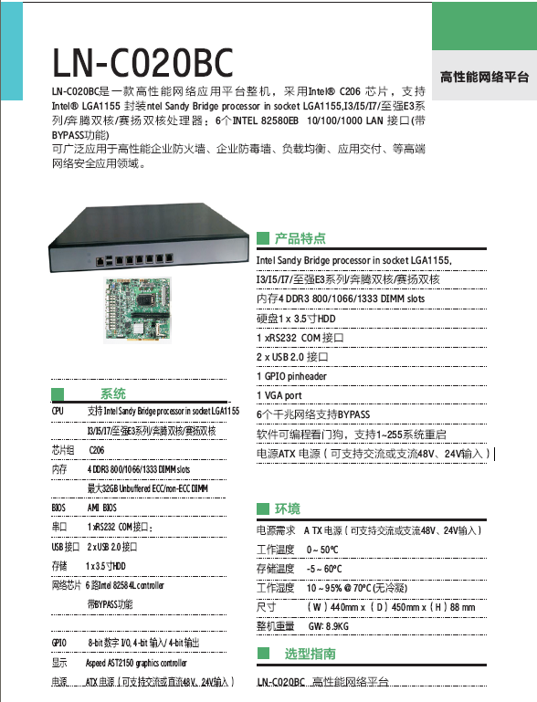 LN-C020BC是一款高性能網絡應用平臺整機, 采用Intel? C206 芯片, 支持 Intel? LGA1155 封裝ntel Sandy Bridge processor in socket LGA1155,I3/I5/I7/至強E3系 列/奔騰雙核/賽揚雙核處理器:6個INTEL 82580EB 10...